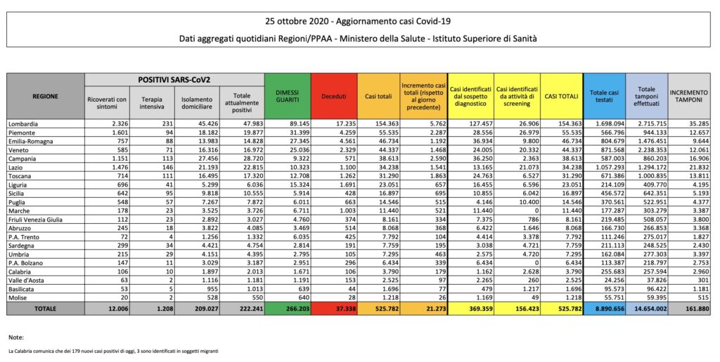 Per il tredicesimo giorno consecutivo è la Lombardia a registrare il maggior numero di casi, ben 5.762. Dietro c’è quindi il Piemonte (2.287), Campania (2.590), Toscana (1.863), Lazio (1.541), Veneto (1.468), Emilia Romagna (1.192).
