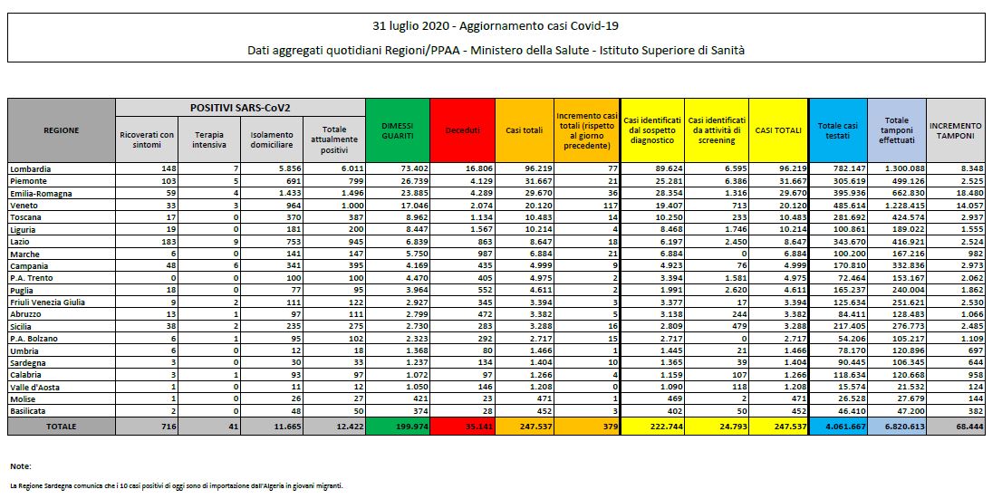 È ancora alto il dato sui nuovi contagi per Coronavirus nel bollettino pubblicato oggi dal Ministero della Salute. Sono infatti 379 i casi registrati nelle ultime 24 ore (ieri erano 386), col totale salito a 247.537 dall’inizio del monitoraggio.