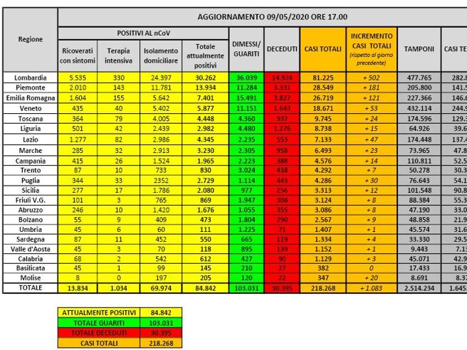 Sono 1.083 i nuovi casi di coronavirus registrati in Italia. Il numero totale dei positivi attuale è di 84.842, il totale è di 218.268. Rispetto a ieri calano gli assistiti di 3.119 unità. La Protezione Civile, nel bollettino del 9 maggio, riporta un totale di 13.834 ricoverati con sintomi, 802 in meno rispetto a ieri. In isolamento senza sintomi o con sintomi lievi 69.974 persone, pari all’82% degli attualmente positivi. Si registrano 194 decessi in più rispetto a ieri, per un totale 30.395. Il numero complessivo dei dimessi e guariti sale invece a 103.031, con un incremento di 4.008 persone rispetto a ieri.