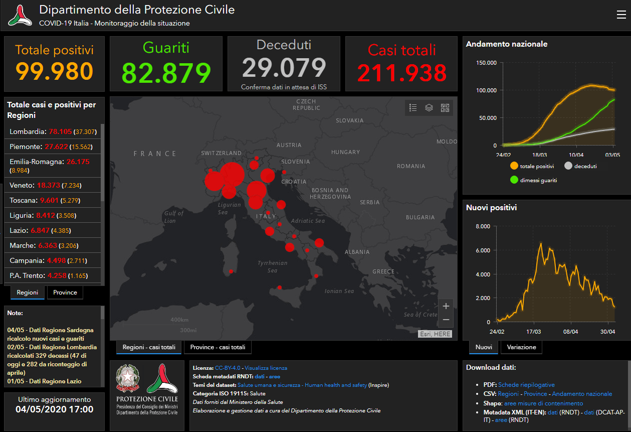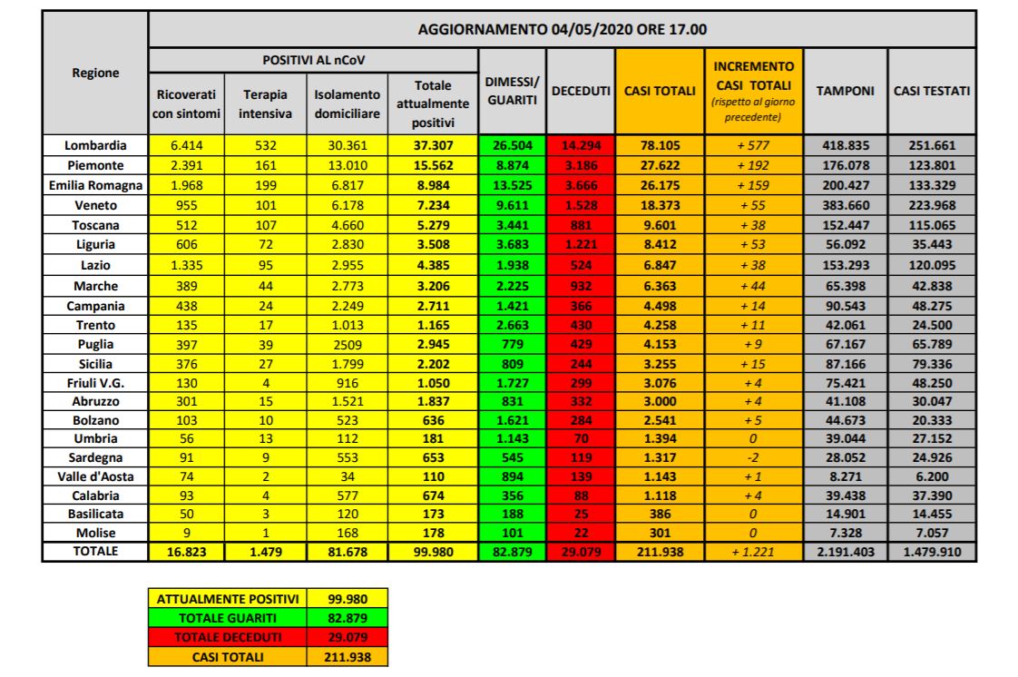 Il totale delle persone che hanno contratto il virus (comprensivo di guariti, casi attuali e decessi) è 211.938, con un incremento rispetto a ieri di 1.221 nuovi casi, mentre il numero complessivo dei dimessi e guariti sale invece a 82.879, con un incremento di 1.225 persone rispetto a ieri.