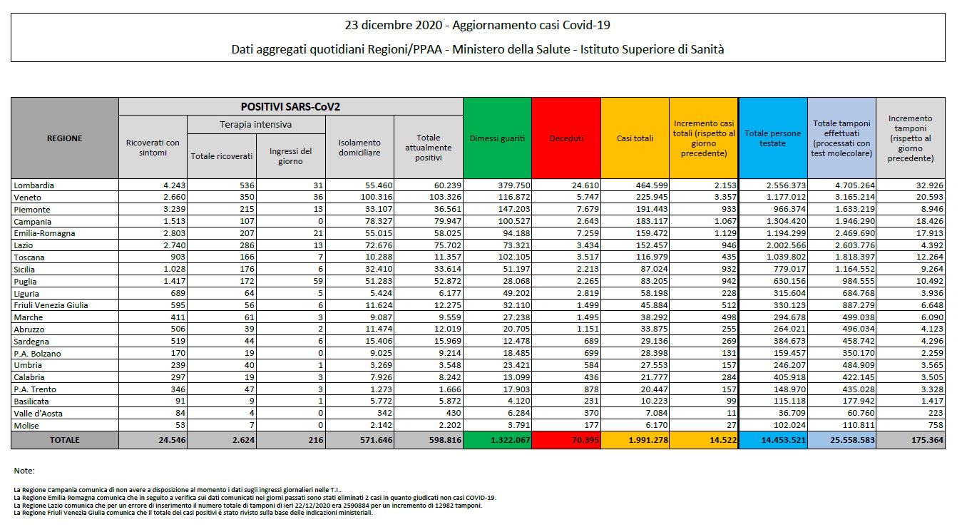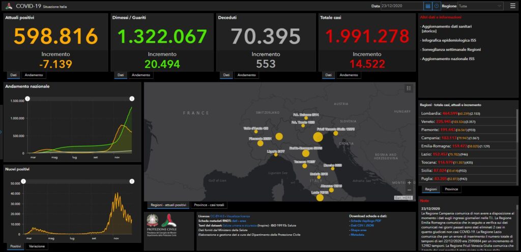 In Italia dall’inizio dell’epidemia di Coronavirus sono oltre 70mila le vittime del Covid-19. È il dato che emerge dal bollettino quotidiano pubblicato da Ministero della Salute e Protezione civile. Il numero totale dei casi sfiora invece i due milioni: sono 1.991.278 le persone che hanno contratto il virus (compresi guariti e morti), con un incremento di 14.522 in 24 ore (ieri erano 13.318). Le vittime nelle ultime 24 ore sono 553 (in calo rispetto alle 628 di martedì 22 dicembre), col totale salito a 70.395.