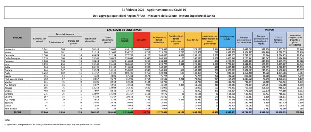 I decessi nelle ultime 24 ore sono stati 232, (ieri 251) per un totale di 95.718 vittime, mentre le persone guarite/dimesse sono 8.946 in più in confronto a ieri, per un totale di 2.324.633 da inizio epidemia.