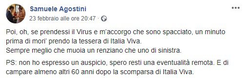 “Poi, oh, se prendessi il Virus e m’accorgo che sono spacciato, un minuto prima di morì prendo la tessera di Italia Viva. Sempre meglio che muoia un renziano che uno di sinistra”. Le parole che fanno infuriare Italia Viva sono impresse in un post su Facebook da Samuele Agostini, segretario dell’Unione comunale del Pd di Casciana Terme Lari, piccolo centro di 12mila abitanti in provincia di Pisa.