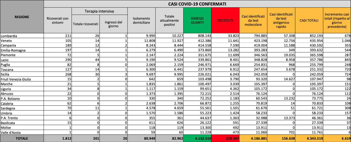 I nuovi positivi al coronavirus emersi nelle ultime 24 ore in Italia sono 6.619, 18 le vittime in un giorno. Il dato dal bollettino quotidiano del ministero della Salute. Il totale delle vittime per complicanze del contagio sono 128.047. Il tasso di positività è sostanzialmente stabile, al 2,67%, rispetto al 2,74% di ieri. La Fondazione Gimbe parla già di quarta ondata in corso in Italia: nell’ultima settimana c’è stato un incremento dei morti del 46% e dei contagi di quasi il 65%.