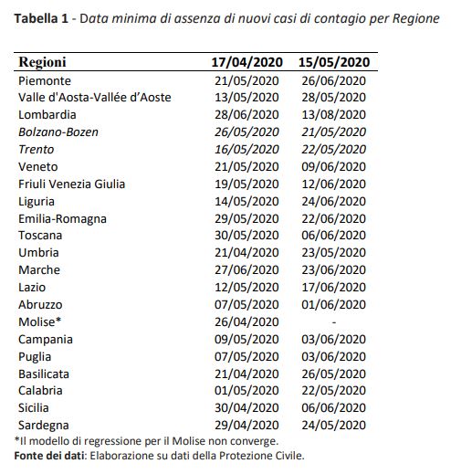 LE PROIEZIONI – Secondo le proiezioni dell’Osservatorio a uscire per prime dal contagio da Covid-19 (cioè zero nuovi casi) dovrebbero essere le due Province Autonome di Bolzano e Trento, seguite dalla Calabria, Umbria, Sardegna e Basilicata, le quali vedrebbero azzerare i nuovi contagi a partire dal 21 maggio. Nel Lazio, Emilia-Romagna, Marche, Liguria e Piemonte l’azzeramento dei contagi dovrebbe avvenire dopo il 17 giugno. Il Molise ha sperimentato un andamento dei contagi molto particolare, qui infatti la curva dei nuovi contagi è pressoché parallela all’asse orizzontale e questo rende impossibile avanzare ipotesi sull’azzeramento. La motivazione potrebbe risiedere nel fatto che negli ultimi dieci giorni sono stati riscontrati nuovi focolai che hanno invertito la dinamica discendente della curva. Ultima regione a uscire dal contagio, come già accennato, sarà la Lombardia, con zero nuovi casi previsti il 13 agosto prossimo.