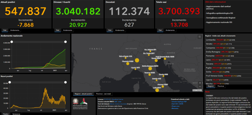 Seicentoventisette morti (627). E’ il numero delle vittime registrate nel bollettino di mercoledì 7 aprile. Un dato altissimo (ieri erano 421) che non si registrava da inizio gennaio: l’8 erano 620 i decessi, il 5 invece ben 649. Con queste cifre sale a 112.374 il totale delle vittime da inizio pandemia.
