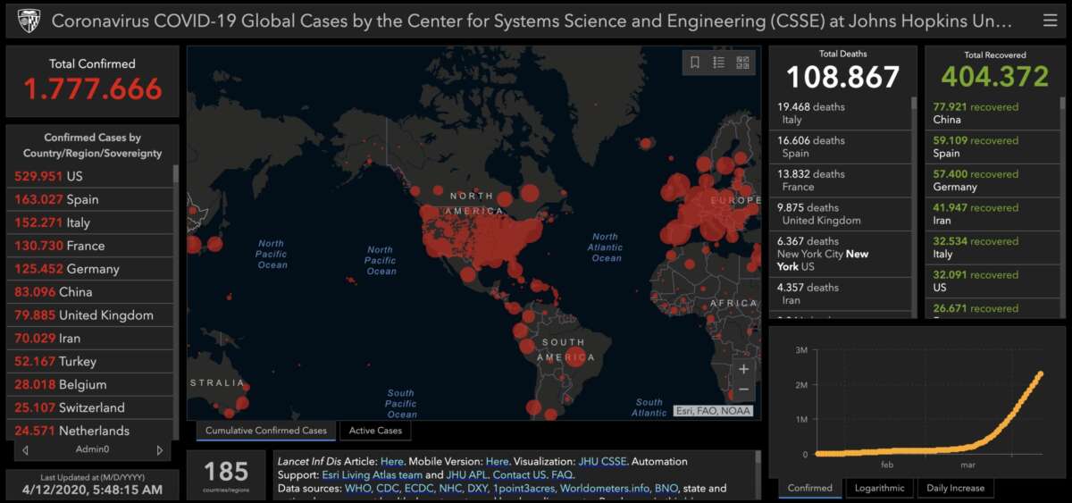 Nel suo ultimo l’università Usa specifica infatti che i casi di persone contagiate negli Stati Uniti sono 529.951, mentre il bilancio dei decessi è salito a 20.506. Nel mondo i casi sono quasi 1,8 milioni (un milione e 777mila per la precisione) e le vittime quasi 109mila.