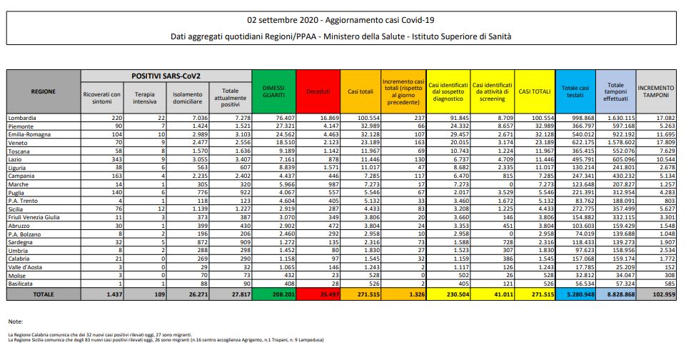 Nelle ultime 24 ore va registrato però anche il record di tamponi processati in Italia da inizio della pandemia di Coronavirus: ne sono stati fatti 102.959 per un totale di 8.828.868. Ieri ne sono stati processati oltre 30mila in meno, ovvero 81.050.