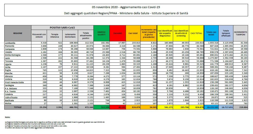 Per Rezza i numeri odierni, ovvero 4mila casi in più con record di sempre (il 31 ottobre erano 31.758), “non sono un buon segnale. I tamponi sono un po’ aumentati ma l’aumento c’è. Abbiamo un numero di tamponi positivi piuttosto elevato, superiamo abbondantemente il 10%, non è un indicatore buono. E purtroppo anche avvicinarsi ai 500 decessi non è una buona notizia. Insomma è una situazione che dopo che nei giorni scorsi sembrava essersi stabilizzata sembra ancora con una chiara tendenza in aumento. Mi sembra che globalmente ancora il virus corra. Frenarlo è necessario”.