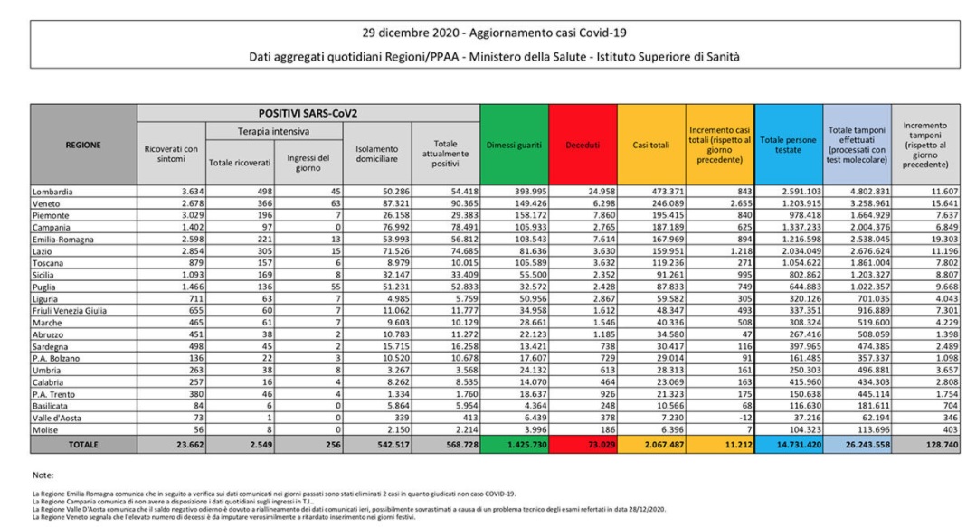 In Italia in 24 ore ci sono stati 11.212 nuovi contagi, +0,5% rispetto al giorno prima (ieri erano +8.585), mentre i decessi odierni sono 659, +0,9% (ieri erano +445), per un totale di 73.029 vittime da febbraio. Le persone guarite o dimesse sono 1.425.730 complessivamente: 17.044 quelle uscite oggi dall’incubo Covid, +1,2% (ieri erano +14.675). E gli attuali positivi — i soggetti che adesso hanno il virus — risultano essere in totale 568.728, pari a -6.493 rispetto a ieri, -1,1% (ieri erano -6.539). La flessione degli attuali positivi di oggi — con il segno meno davanti — dipende dal fatto che i guariti, sommati ai decessi, sono in numero maggiore rispetto ai nuovi casi.