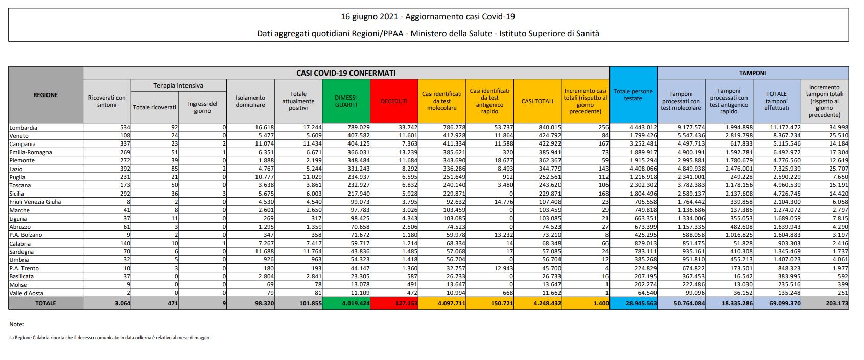 Il bollettino dell'emergenza in Italia