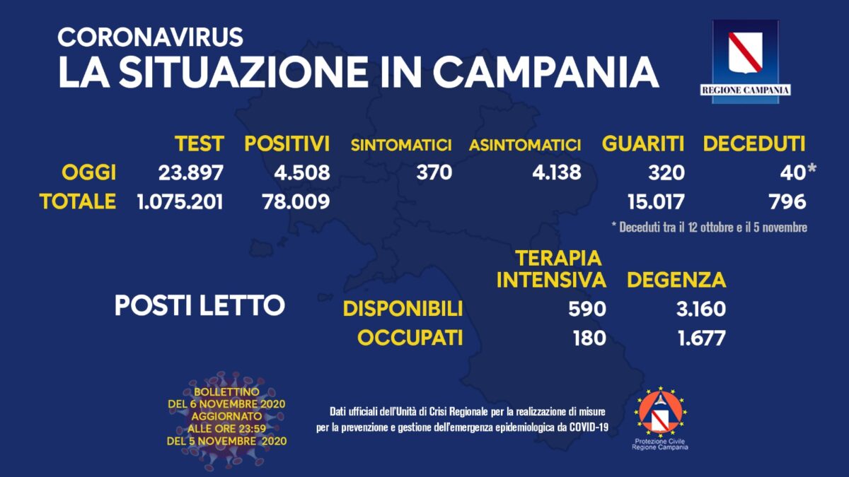 Record di positivi in Campania che nel bollettino di venerdì 6 novembre registra 4.508 contagi (ieri 4.181), di cui 370 sintomatici. I tamponi processati nelle ultime 24 ore sono 23.897 mentre le vittime comunicate sono bene 40. Qui però, precisa la nota dell’Unità di Crisi regionale, bisogna considerare un arco temporale che va dal 12 ottobre al 5 novembre.