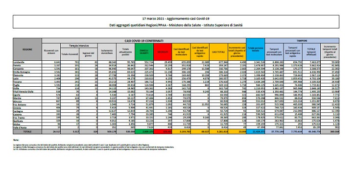 La Regione con più casi giornalieri è la Lombardia, con 4.490 nuovi positivi, seguita da Campania, 2.665, Piemonte, 2.374, Veneto, 2.191, ed Emilia Romagna, 2.026. Domani sarà la giornata nazionale delle vittime del covid-19, così come stabilito all’unanimità dalla Commissione Affari Costituzionali del Senato, riunita in sede deliberante. La ricorrenza a un anno dalla sfilata i mezzi militari che hanno trasportato fuori Bergamo le salme delle vittime. Domani proprio a Bergamo la visita del Presidente del Consiglio Mario Draghi.
