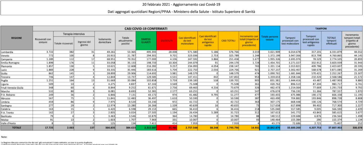 Gli attualmente positivi sono 384.623, in aumento di 2.175 rispetto a ieri. Tra dimessi e guariti in tutto si contano 2.315.687 di casi in Italia, nelle ultime 24 ore c’è un incremento di 12.488 persone. Il totale delle vittime da inizio pandemia è 95.486. Il totale dei casi è pari a 2.795.796.