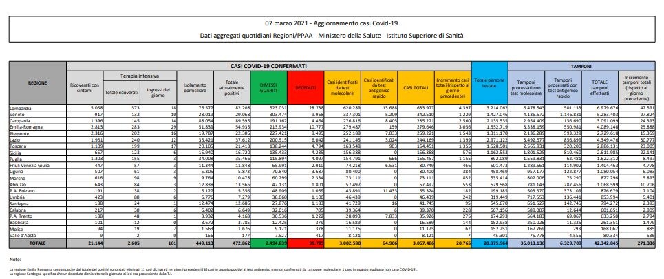 Il totale dei contagi in Italia è salito a 3.067.486 casi. Il totale delle vittime da inizio pandemia raggiunge quota 99.785 deceduti. Gli attualmente positivi in Italia aumentano di 7.050 unità nelle ultime 24 ore e sono 472.862. Tra dimessi e guariti, da ieri c’è un incremento di 13.467 persone e il dato nazionale giunge a 2.494.839. Aumentano sia i ricoveri in ospedale (+443) che i pazienti in terapia intensiva (+34). In totale sono 2.605 i pazienti in terapia intensiva. Nei reparti ordinari sono invece 21.144 i positivi.