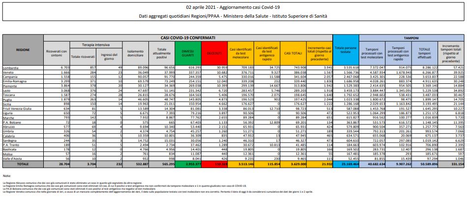 In totale i casi dall’esplosione dell’epidemia sono 3.629.000, i morti 110.328. Gli attualmente positivi sono 565.295 (1.816 in più rispetto a ieri), i guariti e dimessi 2.953.377 (più 19.620), in isolamento domiciliare ci sono 532.887 persone (2.038 in più).