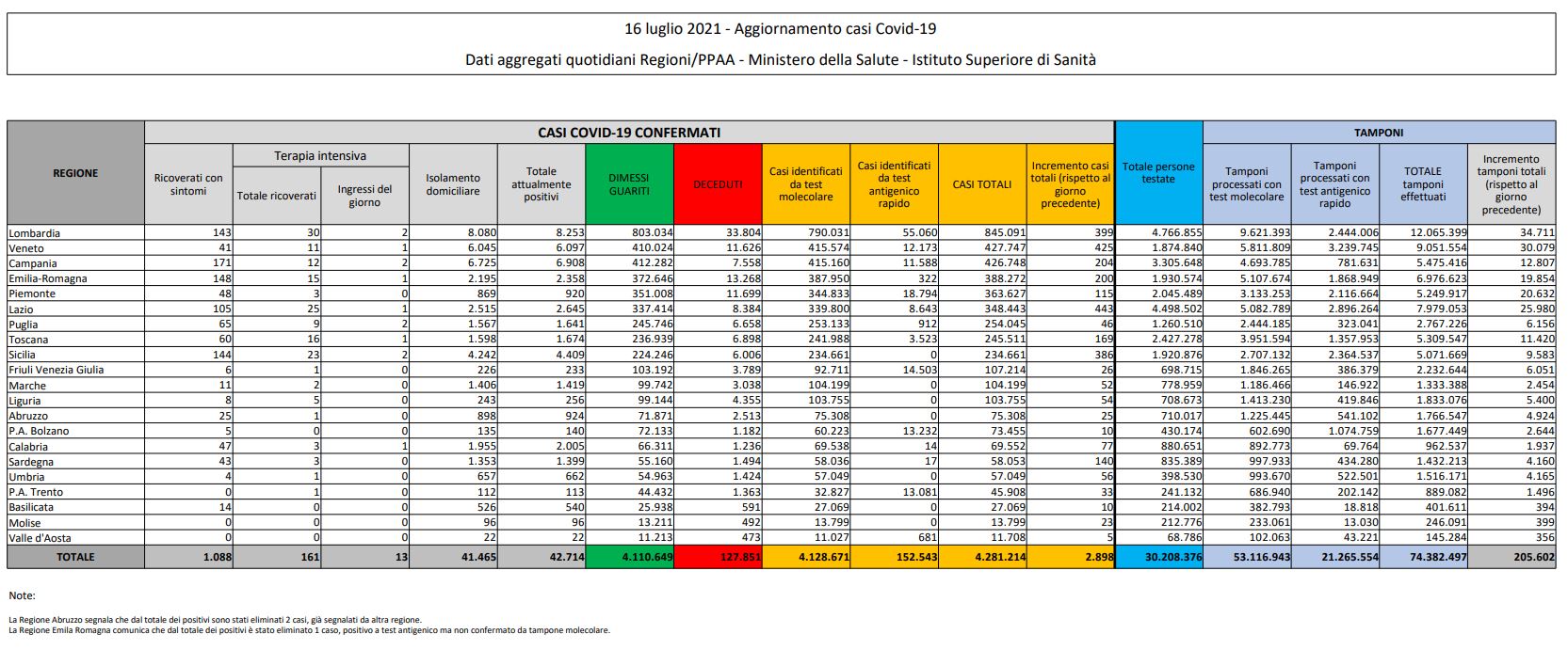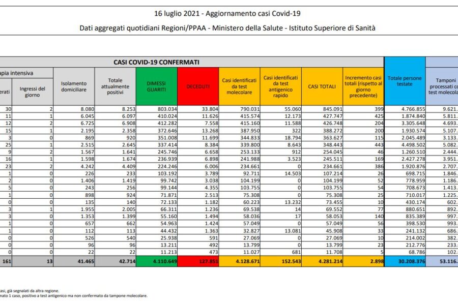 Continuano dunque a salire i casi giornalieri. I nuovi contagiati ieri erano stati 2.455 con un tasso di positività all’1,3% e nove vittime. Erano stati 190.922 i test processati ieri. “Il quadro generale della trasmissione dell’infezione torna a peggiorare con molte regioni a rischio moderato. Fortunatamente in questa fase l’impatto della malattia sulla ospedalizzazione rimane minimo. La variante Delta è destinata a crescere e in altri paesi sta portando grande aumento di nuovi casi: è quindi importante tracciare i contatti e prevedere le quarantene ed è opportuno raggiungere quanto prima la copertura vaccinale con la doppia dose. Questa è una delle priorità”, ha detto il presidente dell’Istituto Superiore di Sanità Silvio Brusaferro durante la conferenza stampa sul monitoraggio settimanale della Cabina di regia.