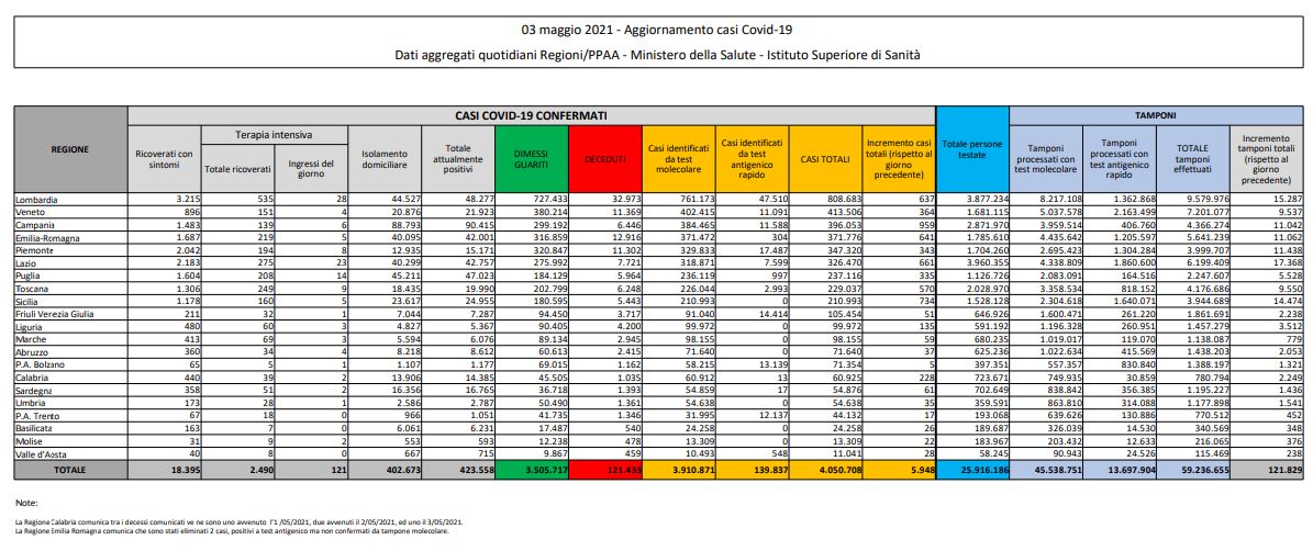 Il totale dei casi dall’inizio della pandemia sale quindi a 4.050.708. Il totale dei morti a 121.433. Gli attualmente positivi sono 423.558, in calo di 7.348 rispetto a ieri. Tra dimessi e guariti si contano 3.505.717, un incremento di 13.038 casi.