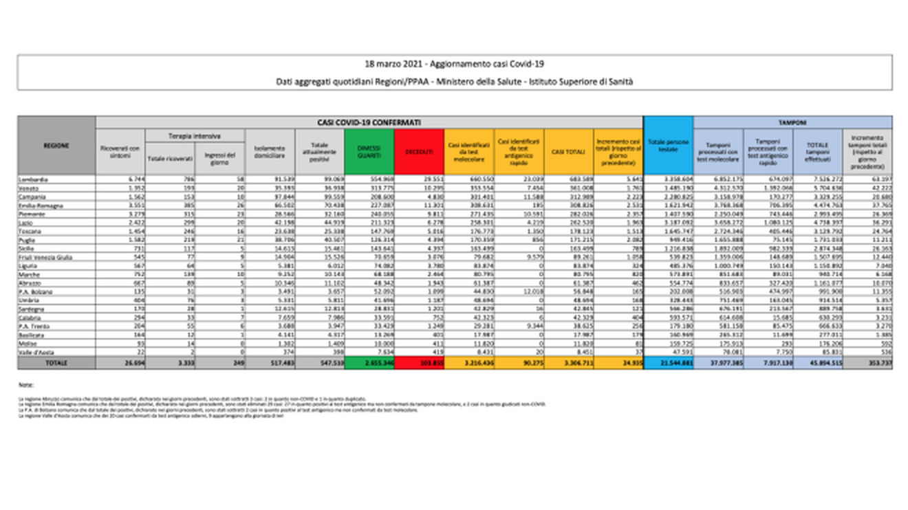 Al momento i positivi in Italia sono 547.510, in aumento di 8.502 unità rispetto a ieri. Tra dimessi e guariti si contano in tutto 2.655.346 persone, in aumento di 15.976 unità. Il totale delle vittime sale a 103.855, quello dei casi positivi a 3.306.711.
