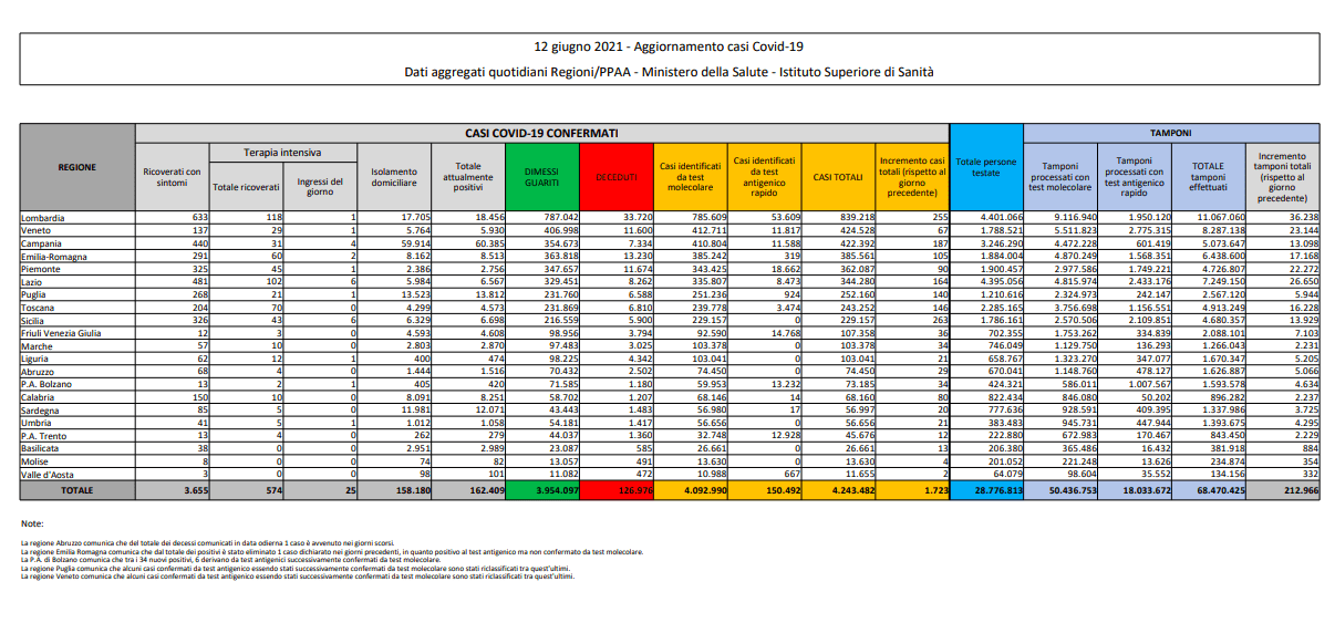 Per quanto riguarda le Regioni sono 255 i nuovi positivi in Lombardia, la Regione più colpita, a seguire Campania, 187, Lazio, 164, Toscana, 146, Puglia, 140. La campagna vaccinale prosegue e a oggi sono oltre 41 milioni e 400mila le somministrazioni effettuate in Italia, più di 13 milioni e 900mila le persone che hanno completato il ciclo. Da lunedì due terzi degli italiani passeranno in Zona Bianca: l’elenco delle Regioni nell’area a più basso rischio contagio si arricchisce con Emilia Romagna, Lombardia, Lazio, Piemonte, Provincia di Trento e Puglia.