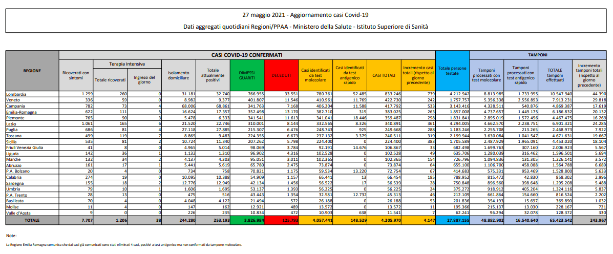 Il tasso di positività sale all’1,7% rispetto a ieri quando si era attestato all’1,5%. Gli attualmente positivi sono 253.193, in calo di 6.836 casi. Tra dimessi e guariti si contano 3.826.984 persone, con un incremento di 10.808 casi rispetto a ieri.