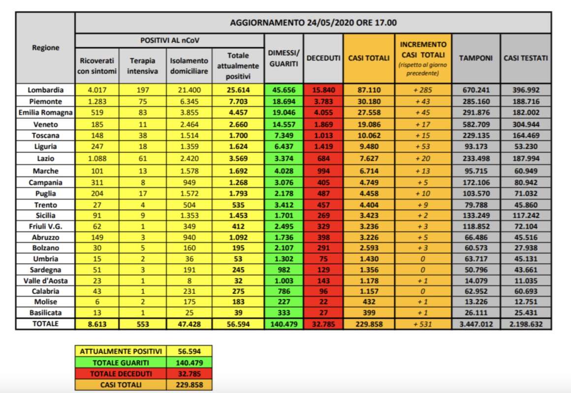 Ad oggi quindi i casi totali di persone colpite dal virus è salito a quota 229.858 dall’inizio del monitoraggio, con un incremento di 531 casi in in un giorni (ieri era di 669). Nelle ultime 24 ore inoltre sono stati effettuati 55.824 tamponi, con un totale che sale così a 3.447.012.
