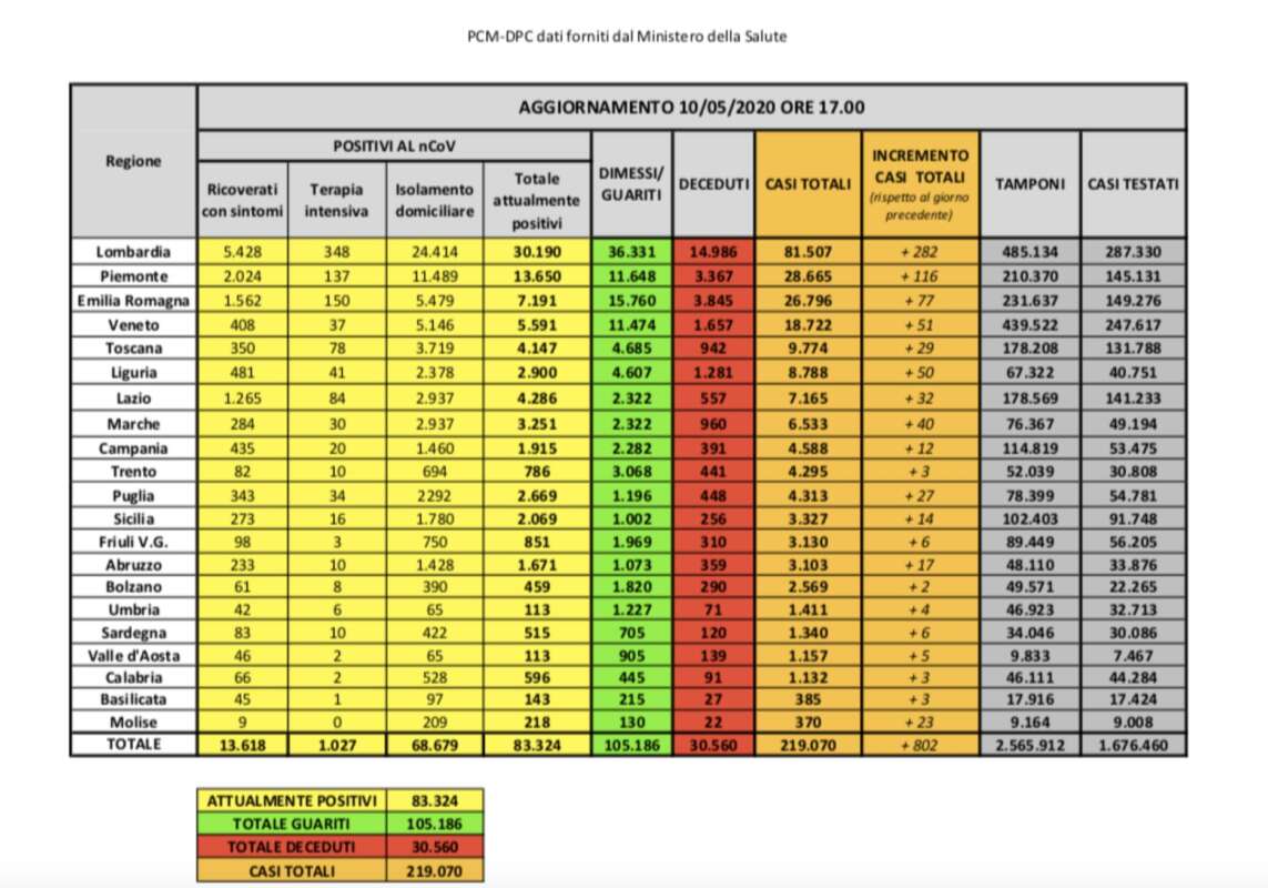Il numero totale di attualmente positivi è di 83.324, con una decrescita di 1.518 casi rispetto a ieri. Il totale delle persone che hanno contratto il virus (comprendono malati, vittime e guariti) è 219.070, con un incremento rispetto a ieri di 802 nuovi casi, mai così pochi dal 6 marzo scorso.