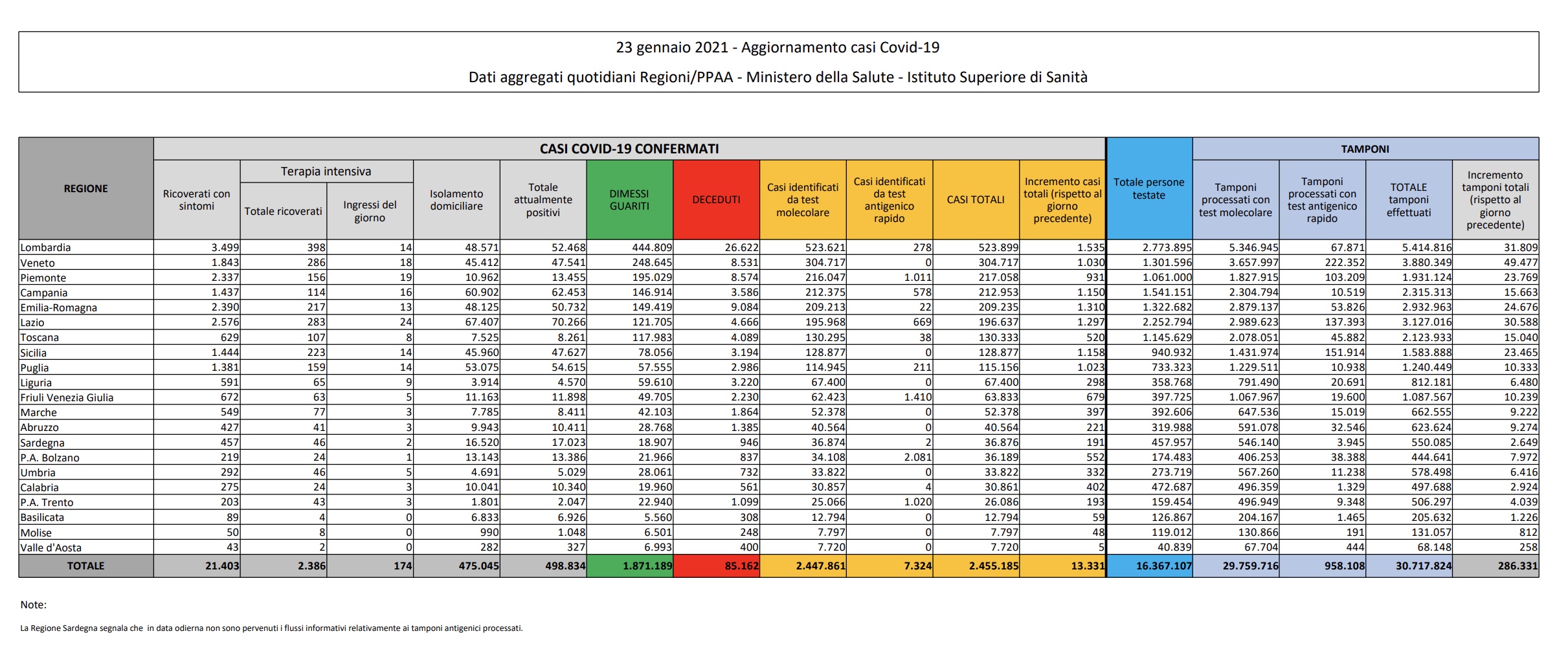 Gli italiani attualmente positivi al Coronavirus sono totale 498.834, in calo di 3.219 in confronto al dato di ieri: di questi 2.386 sono ricoverati in terapia intensiva, in calo di 4 nel saldo tra entrate e uscite rispetto a ieri. Nei reparti ordinari sono invece ricoverati 21.403 pazienti, in calo di 288 unità rispetto a venerdì.