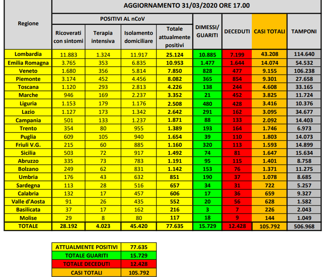 In particolare i decessi nelle ultime 24 ore sono stati 837 (ieri 812), ben 1109 i guariti (ieri 1590) e 2107 i nuovi casi positivi al Coronavirus. Dall’inizio dell’emergenza il totale dei pazienti positivi al Covid-19 sono 77635, 15729 i deceduti e 15729 i guariti.