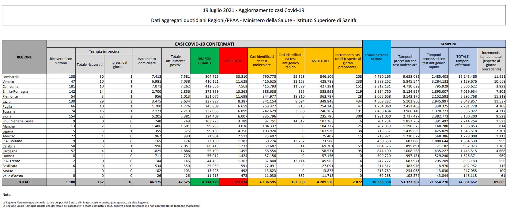 Sono 27.120.766 gli italiani completamente vaccinati, pari al 50,21 % della popolazione over 12. Secondo il sito del Governo, in totale sono 61.543.227 le dosi somministrate, pari al 92,9% di quelle attualmente a disposizione delle regioni (dati in aggiornamento). La campagna vaccinale prosegue con numeri alti: anche nella settimana passata si è superato il livello di 3,8 milioni di dosi, dato superiore alle due settimane precedenti. Tuttavia, la somministrazione delle prime dosi continua ad essere inferiore alle 100 mila al giorno (per un totale di oltre 580 mila effettuate complessivamente nella settimana passata).