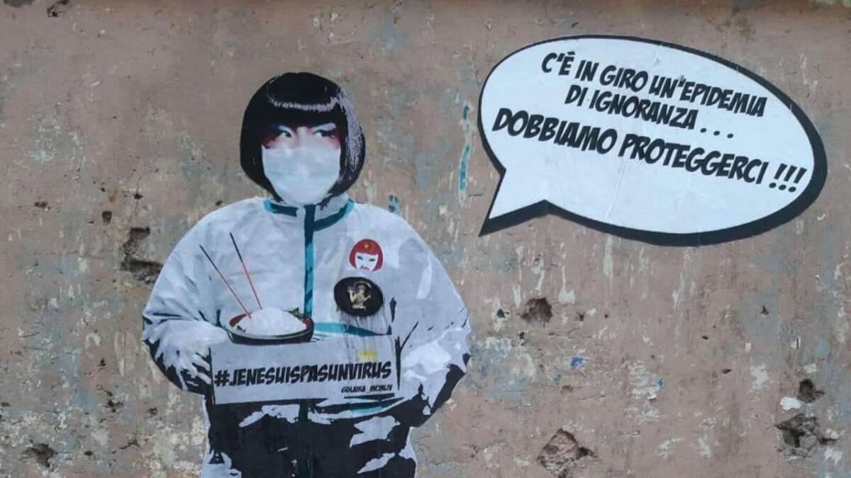 “C’è in giro epidemia di ignoranza. Dobbiamo proteggerci”. Questa frase potrebbe sembrare retorica, eppure la street artist Laika ha sentito l’esigenza di lasciare il segno sui muri di Roma con un murale contro la psicosi da coronavirus. Il murale si trova a Piazza Vittorio nel cuore del quartiere multietnico della città, l’Esquilino, conosciuto anche come la Chinatown di Roma. Lì in zona c’è “Hang Zhou”, il ristorante gestito da Sonia la ristoratrice cinese protagonista del murale.