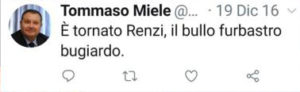 Pochi giorni fa, Il Foglio aveva raccontato come il dottor Tommaso Miele, favorito per la nomina a presidente della Corte dei Conti per la sua vicinanza al M5s, attraverso il suo account Twitter (successivamente disattivato) avesse ripetutamente espresso giudizi offensivi nei confronti dell’allora segretario del Pd: «È tornato Renzi, il bullo furbastro bugiardo». «Oggi giorno di festa comandato dal Signore: è tornato sulla scena il cazzaro di Rignano sull’Arno. Ancora parla. Ha la faccia come il…». Sono solo alcuni dei tweet in cui Miele attaccava Renzi, esprimendo il suo appoggio al partito di Luigi Di Maio: «Per evitare che torni Micron (che proprio non lo reggo) voterò convintamente M5s», diceva. Rispetto all’eventualità che Tommaso Miele, dopo aver pubblicamente dichiarato di essere un sostenitore del M5s, possa diventare il prossimo presidente della Corte dei Conti Renzi ha dichiarato che «Quella è una scelta che tocca al governo, non a me».