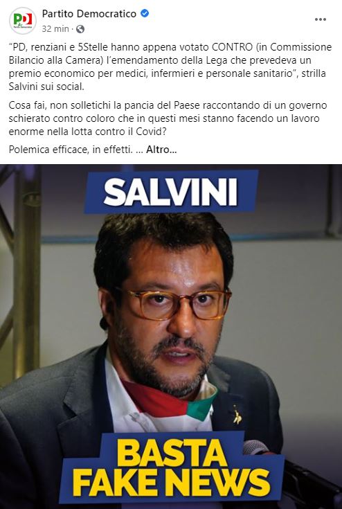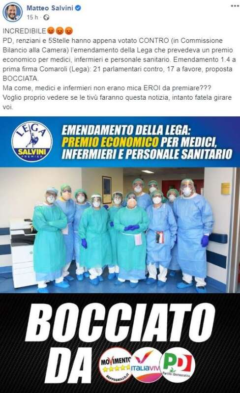 “INCREDIBILE! PD, renziani e 5Stelle hanno appena votato CONTRO (in Commissione Bilancio alla Camera) l’emendamento della Lega che prevedeva un premio economico per medici, infermieri e personale sanitario. Emendamento 1.4 a prima firma Comaroli (Lega): 21 parlamentari contro, 17 a favore, proposta BOCCIATA”. È il messaggio comparso ieri sui profili social di Matteo Salvini e della Lega, un attacco alla maggioranza giallo-rossa in cui il leader del Carroccio sostiene che l’esecutivo ha bocciato l’emendamento leghista che prevedeva un premio per medici, infermieri e personale sanitario che ha affrontato l’emergenza Covid-19.