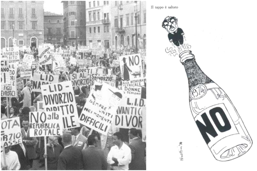 Quell’anno è riassunto in una famosa vignetta di Giorgio Forattini, allora genio del quotidiano comunista romano “Paese sera” – e che diventerà l’editorialista grafico della prima pagina di “Repubblica” quando nascerà nel 1976 anche se poi Giorgio e la sinistra divorziarono clamorosamente. La vignetta era quella di una bottiglia di champagne da cui salta il tappo con la faccia di Amintore Fanfani. Sono passati troppi anni perché tutti possano capire e ricordare, la maggior parte di chi legge probabilmente non c’era o era troppo piccola e quindi va ricordato che il divorzio istituito in Italia del 1970 fu frontalmente minacciato da un referendum abrogativo voluto a tutti i costi dal leader democristiano Amintore Fanfani che era un uomo molto complesso è molto basso.