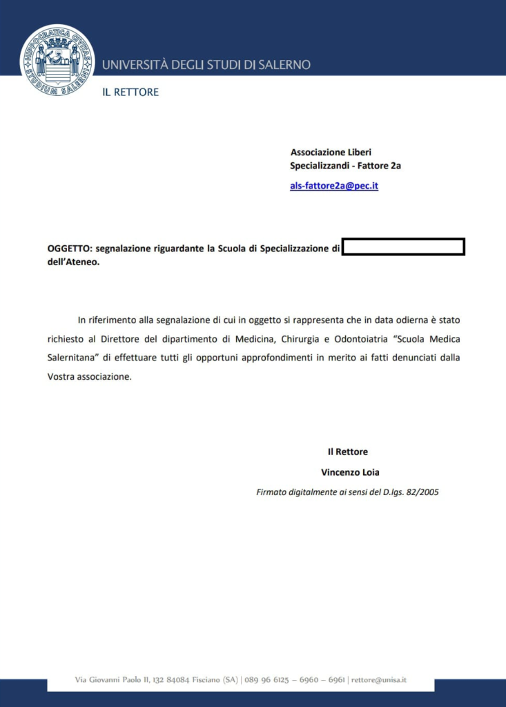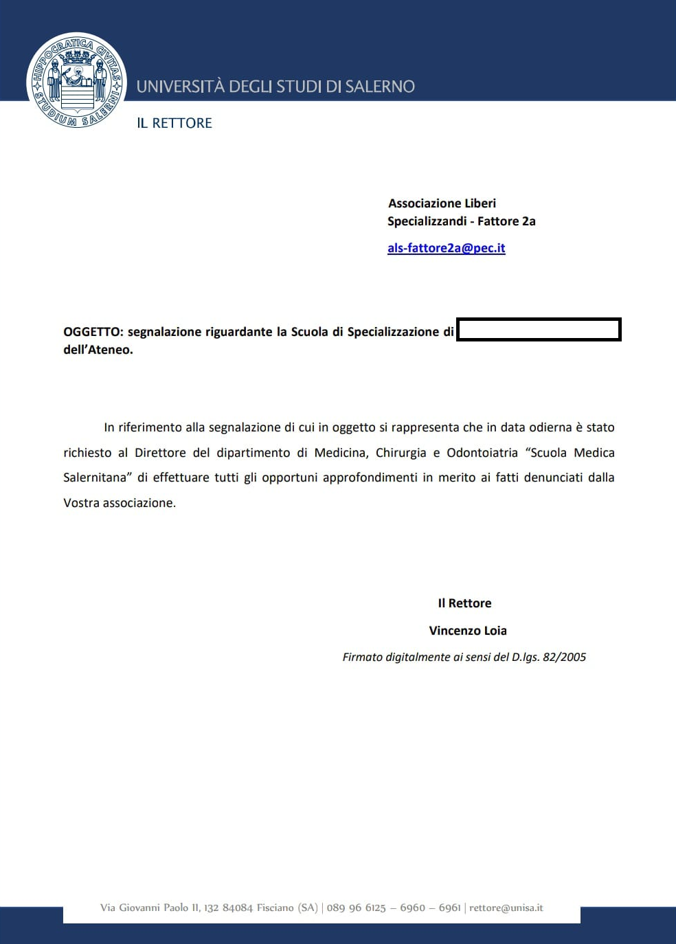 “Vogliamo complimentarci e ringraziare pubblicamente il rettore – è invece il commento dell’associazione che ha denunciato la situazione nella Scuola di specializzazione – gli auguriamo buon lavoro nella verifica della verità dei fatti e saremo come ALS in vigile e fiduciosa attesa sull’evolversi della vicenda di cui vi terremo aggiornati. Siamo soddisfatti che questo avvenimento abbia aumentato la fiducia degli specializzandi verso la nostra associazione: negli ultimi giorni stiamo ricevendo diverse richieste di aiuto inerenti problematiche più o meno gravi. Molti specializzandi stanno finalmente capendo che, in una scuola in cui ci sono illegalità, gli unici ad avere paura devono essere i professori“.