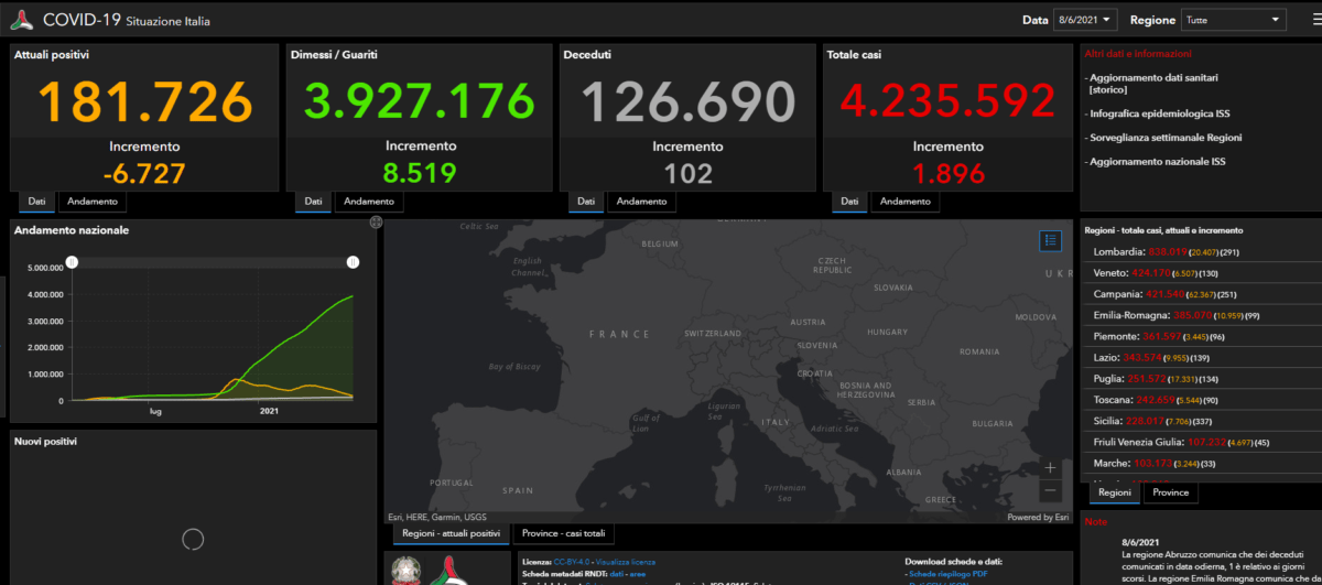 Le persone guarite o dimesse sono complessivamente 3.927.176 (+ 8.519) mentre gli attualmente positivi sono 181.726, in calo di 6.727 unità. La Sicilia è la regione che registra più contagi (337) seguita da Lombardia (291) e Campania (251).
