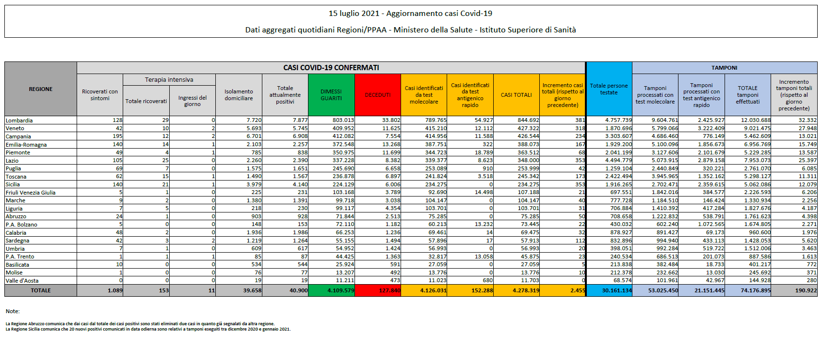 Diminuiscono le vittime: sono 9 contro le 23 di ieri. Si tratta del secondo dato più basso del 2021, dopo i 7 decessi di domenica 11 luglio (sappiamo che spesso la domenica il dato dei decessi è incompleto, mentre non lo è il giovedì). Sono 11 le regioni con zero lutti, alle quali si aggiungono le Province di Trento e Bolzano. Tra queste c’è la Lombardia, nessun decesso da due giorni, che oggi ha il maggior numero di contagiati.