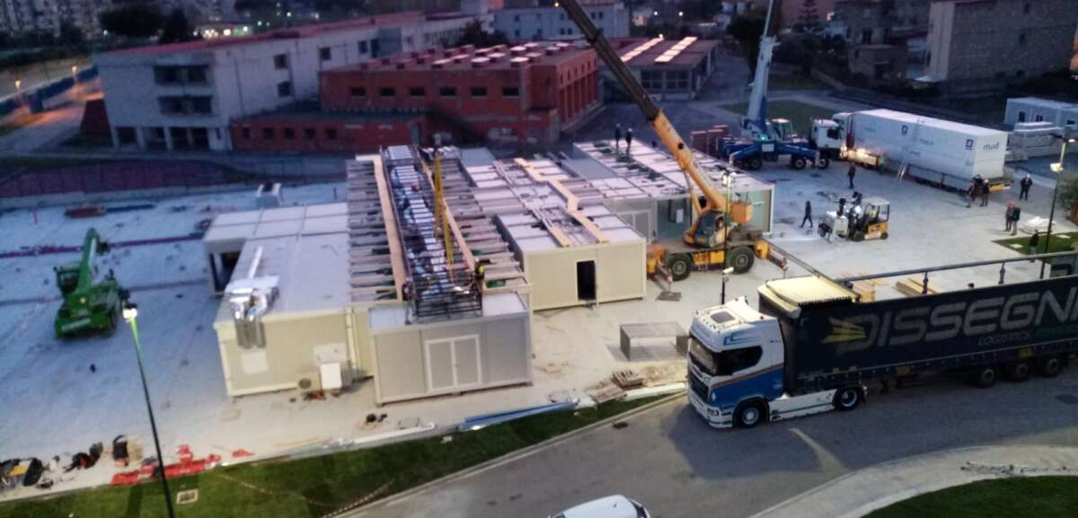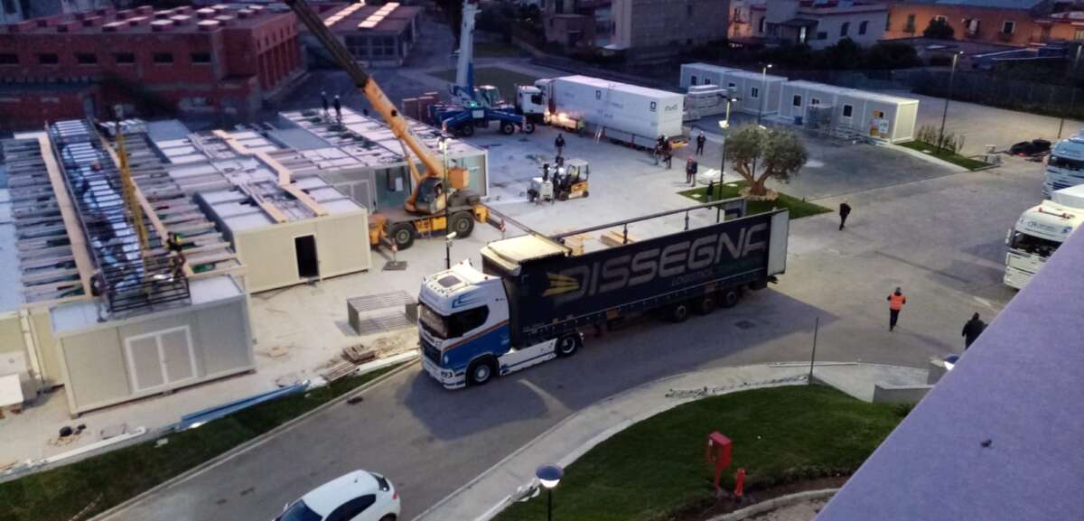 Procedono spediti i lavori per la costruzione dell’ospedale da campo a Napoli. Dopo l’arrivo ieri sera, tra gli applausi dei cittadini, dei 57 camion provenienti da Padova, nella giornata di oggi sono stati installati i moduli prefabbricati che andranno a formare il Covid-center (da 72 posti totali di terapia intensiva) che sorgerà a ridosso dell’Ospedale del Mare a Ponticelli, periferia est della città.