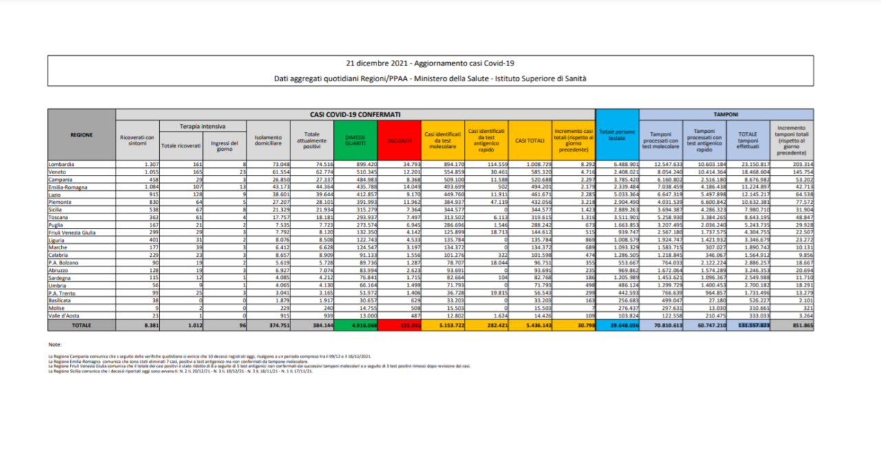 Nella giornata odierna va segnalato anche il record di tamponi, ben 851.865, con un tasso di positività del 3,6%.
