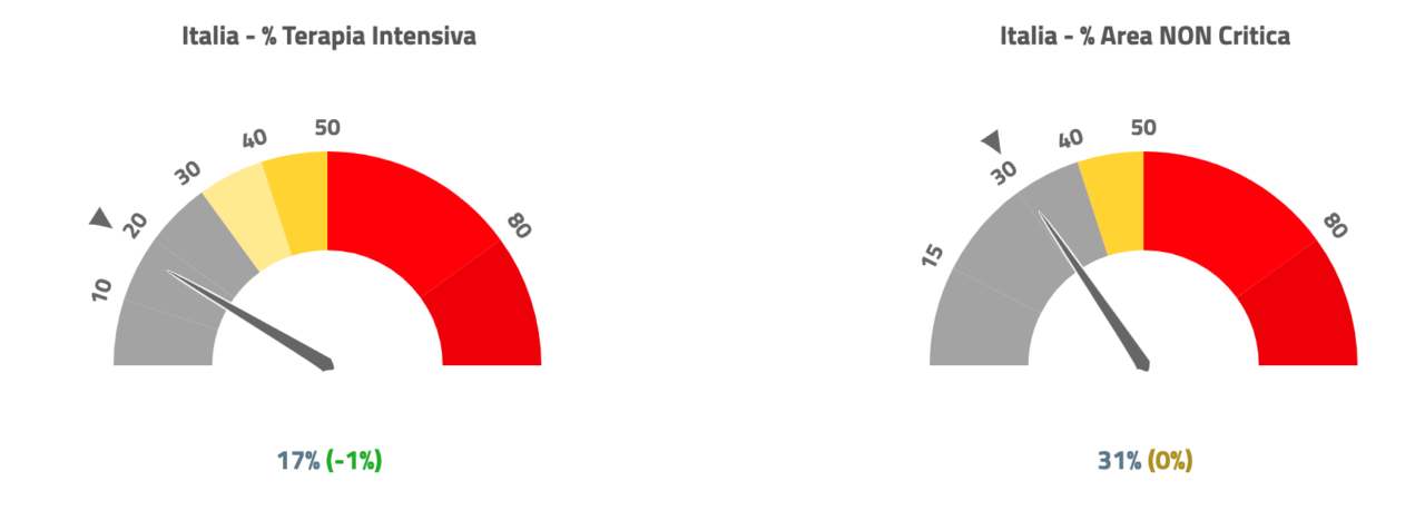 È infatti in diminuzione il dato nazionale sull’occupazione delle terapie intensive, sceso al 17% (-1), mentre resta stabile al 31 per cento quello dell’area non critica.