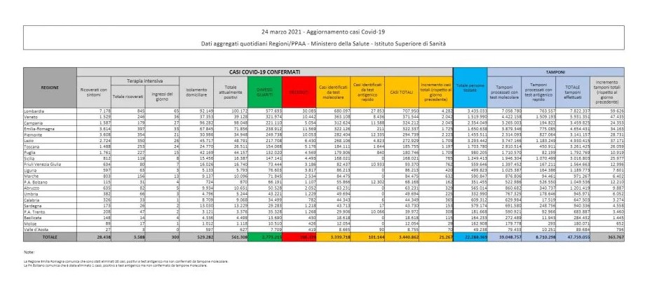 Il tasso di positività sale dal 5,6% di ieri sale al 5,8%. Il totale dei positivi dall’inizio della pandemia sale a 3.440.862, quello delle vittime a 106.339. Gli attualmente positivi sono 561.308, con un incremento di 654 unità. Tra gueriti e dimessi si contano 2.773.215 persone, 20.132 in più rispetto a ieri. Gli ingressi in rianimazione sono 300, ieri erano stati 317). Nei reparti ordinari sono invece ricoverate 28.438 persone, con un incremento di appena 10 unità nelle ultime 24 ore.