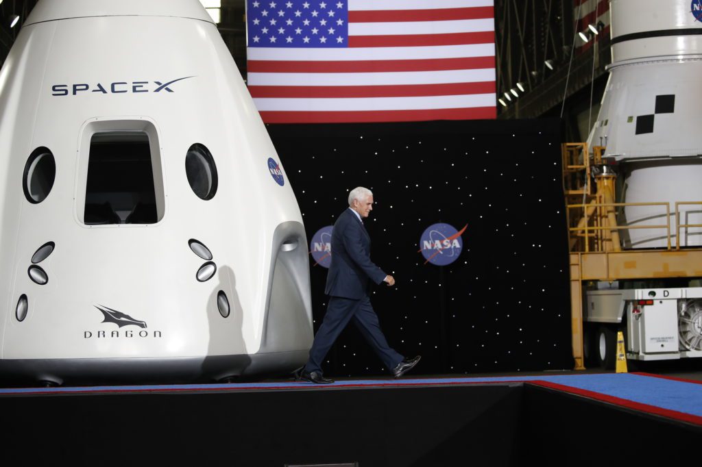 Vice President Mike Pence walks to a podium to speak at the Vehicle Assembly Building on Saturday, May 23, 2020, at NASA's Kennedy Space Center in Cape Canaveral, Fla. A rocket ship designed and built by SpaceX lifted off on Saturday with two Americans on a history-making flight to the International Space Station. (AP Photo/Alex Brandon)more