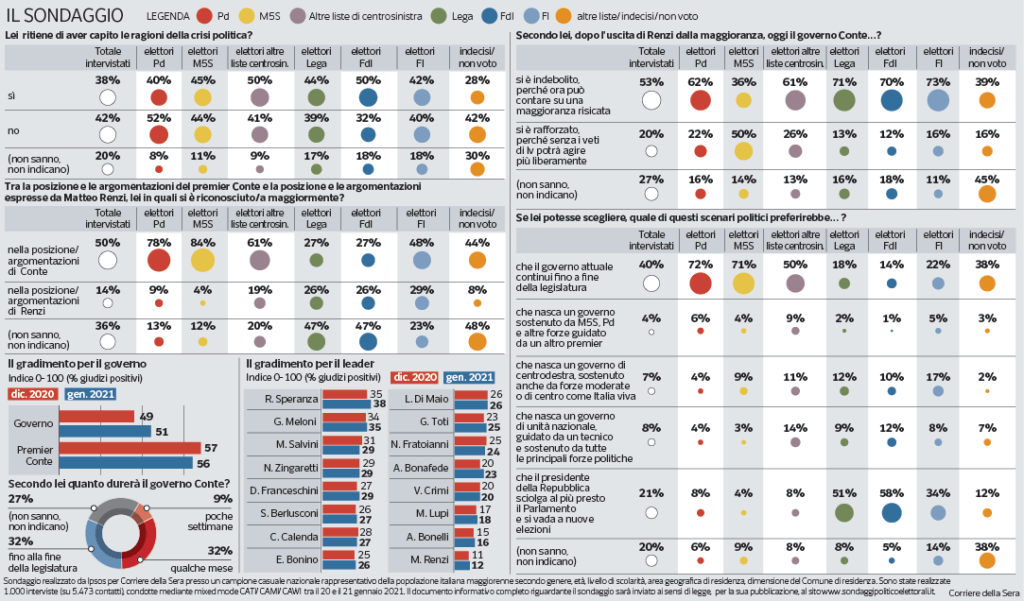 Pur non volendo andare alle urne, è opinione diffusa quella che la crisi di governo innescata dalle dimissioni delle ministre renziane Bonetti e Bellanova abbia indebolito il governo Conte (53%), mentre un 20% reputa che l’uscita di Italia Viva dalla maggioranza permetterà all’esecutivo più libertà d’azione e coesione. Tra coloro che si professano del Pd, il 62% è convito che l’esecutivo si sia indebolito, mentre tra i grillini il 50% pensa che si sia rafforzato.