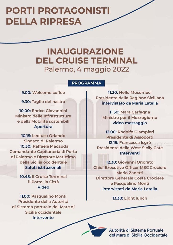 Ad aprire l’evento sarà Enrico Giovannini, ministro delle Infrastrutture e della Mobilità sostenibili. Con il presidente dell’Autorità di Sistema portuale del Mare di Sicilia occidentale, Pasqualino Monti, ci saranno Nello Musumeci, presidente della Regione siciliana, Leoluca Orlando, sindaco di Palermo, Raffaele Macauda, comandante della Capitaneria di Porto di Palermo e Direttore Marittimo della Sicilia occidentale, Rodolfo Giampieri, presidente di Assoporti, Francesca Isgrò, presidente West Sicily Gate, Giovanni Onorato, chief executive officer di MSC Crociere, Mario Zanetti, direttore generale di Costa Crociere. La giornalista Maria Latella intervisterà i protagonisti della giornata. E’ previsto anche un videomessaggio del ministro per il Mezzogiorno Mara Carfagna.