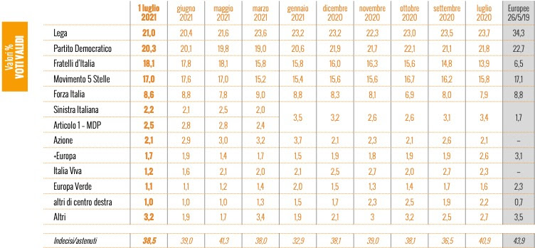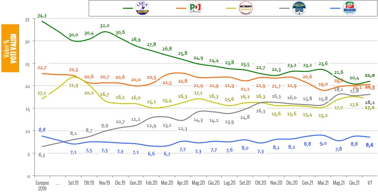 Nel sondaggio Ixè Fratelli d’Italia è ancora particolarmente staccata dal Carroccio, a differenza di altri istituti di ricerca che danno Meloni e soci addirittura sopra il partito di Salvini. FDI per Ixè si attesta al 18,1%, comunque in trend positivo rispetto al 17,8% di giugno. Cala invece Forza Italia: il partito di Silvio Berlusconi è stimato all’8,6% (-0,2%) dopo settimane di discussione sulla federazione di centrodestra con Salvini che hanno portato alla destabilizzazione interna agli ‘azzurri’, tra favorevoli e contrari all’ipotesi lanciata dal leader della Lega.