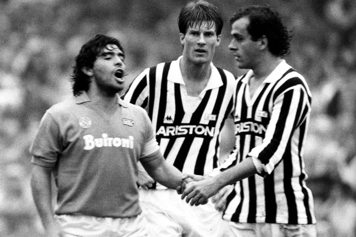 La droga (absit iniuria verbis) che mi riportò al tifo prese il nome di Diego Armando Maradona, anche se nel suo gorgo magico fui trascinato più dall’antipatia per la Juve di Platini, che da un amore sincero per il ciuccio. Fatto sta che per alcuni anni frequentai da abbonato la tribuna laterale B del San Paolo e fu dal mio posto (dire posto è un eufemismo, all’epoca si stava sempre e solo in piedi, grosso modo nei pressi del sediolino cui si aveva pur sempre diritto), che assistetti da vicino alla prima, forse più grande magia, del Pibe de Oro (altro che gol all’Inghilterra…). Sotto una pioggia torrenziale, in una punizione a due in area, con la barriera avversaria schierata a pochi passi, quel dannato ordinò a Pecci di toccargli la palla che, teleguidata dal suo sinistro come un drone, si sollevò da terra, scavalcò i birilli juventini e andò a gonfiare la rete dell’esterrefatto Tacconi. Lì capimmo che il botolo veniva da un altro pianeta. E la mia partecipazione alla messa cantata della domenica divenne costante ed entusiastica, smorzata solo dall’assoluto fastidio per l’identificazione tra le vittorie del Napoli e una presunta “rinascita della città”, chiacchiera futile che si faceva strada anche tra insospettabili intellettuali. Quindi il mio tifo era sempre temperato e sospettoso. Amavo Maradona, non la sociologia urbana da quattro soldi. Mi esaltavo per il suo sinistro che dipingeva il campo, non per il Vesuvio che risorgeva.