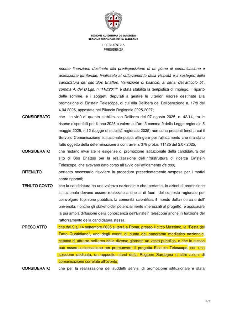 La Regione Sardegna, presieduta da Alessandra Todde del M5S, ha stanziato con affidamento diretto 68.235 euro di denaro pubblico per sponsorizzare la Festa del Fatto Quotidiano che si terrà a Roma dal 9 al 14 settembre. Una decisione deliberata l’8 agosto scorso con una Determina di spesa nell’ambito della strategia INNOVARE – macro azione Einstein Telescope, «con l’obiettivo di promuovere la candidatura a ospitare nella miniera di Sos Enattos a Lula» (provincia di Nuoro) un’infrastruttura sotterranea in grado di rilevare le onde gravitazionali provenienti dallo spazio profondo.