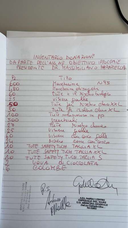 Una iniziativa lodevole quella concretizzata dall’associazione Obiettivo Ippocrate, guidata dal medico-presidente Massimiliano Zaranella, che ha sede in Veneto ma iscritti in tutta Italia. Un gesto di solidarietà nato dalla forte amicizia tra la dottoressa Gabriella Oliva, dirigente medico della Medicina Interna dell’Ospedale del Mare, reparto guidato dal direttore Ernesto Grasso, e Valeria Marcolin, responsabile di una Ong in Francia ma originaria di Vicenza.