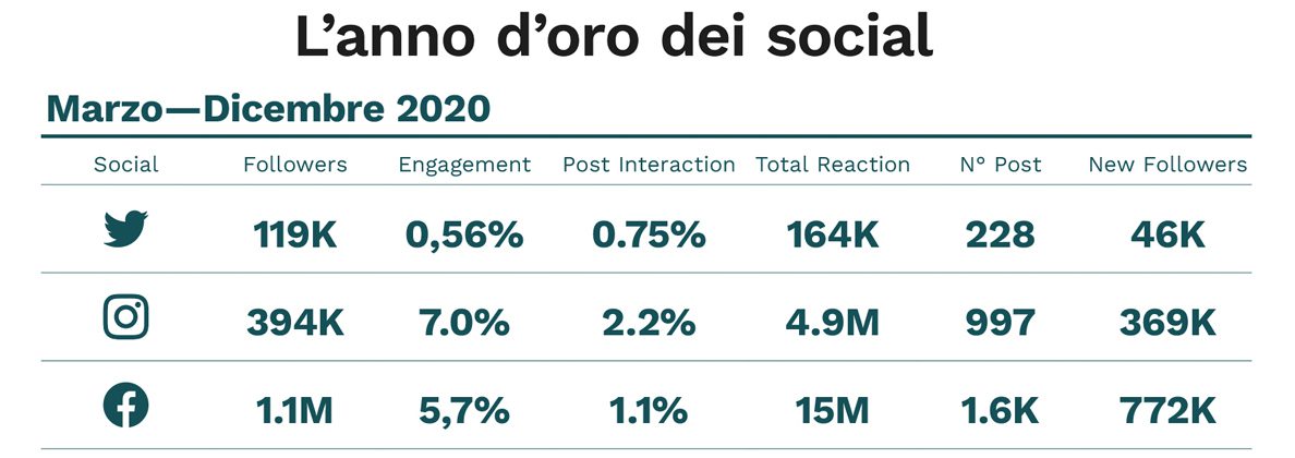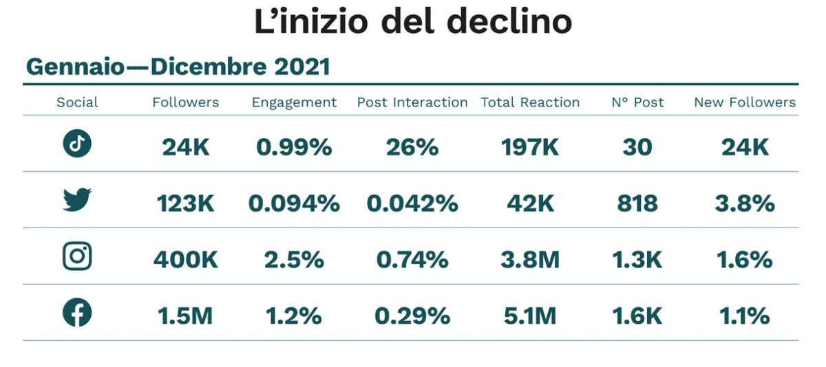 Anzi, con il venir meno del diffuso senso di paura, grazie anche all’avvio della campagna di vaccinazione di massa, si manifesta una costante perdita di audience digitale: tutti gli indicatori segnano un calo anche consistente dell’attenzione da parte degli utenti. Le percentuali di engagement degli account Facebook e Instagram perdono rispetto all’anno precedente i due terzi della loro capacità di coinvolgimento, le interazioni totali scendono rispettivamente da 15 a 5 milioni per Facebook e da 4,9 a 3,8 milioni su Instagram, nonostante la mole di post pubblicati.