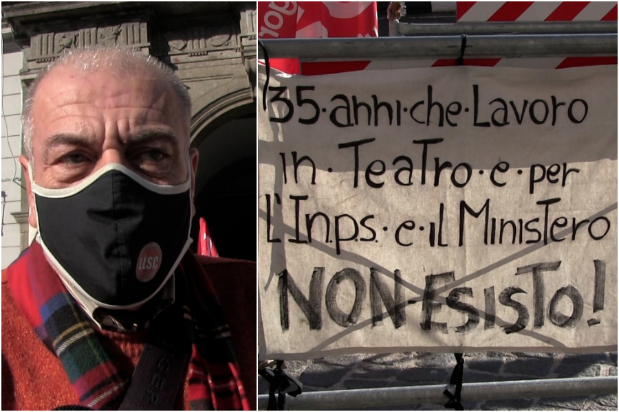“Lavoro in teatro da 35 anni ma per Ministero e Inps non esisto”. Su un cartello, nero su bianco Gianfranco Izzo, tecnico teatrale, ha racchiuso in poche parole il dramma suo e di tanti altri operatori dello spettacolo che da mesi non lavorano, non percepiscono stipendio e sono in balia di bonus a pioggia che non sempre rappresentano un buon investimento per il settore. Così Gianfranco e tanti altri lavoratori del Coordinamento Arte e Spettacolo Campania ogni giorno a Napoli scendono in Piazza Plebiscito e ci restano da mattina a sera in presidio permanente. “Ci resteremo finchè non avremo un incontro serio con il Ministero e con l’assessorato al lavoro della Regione”.